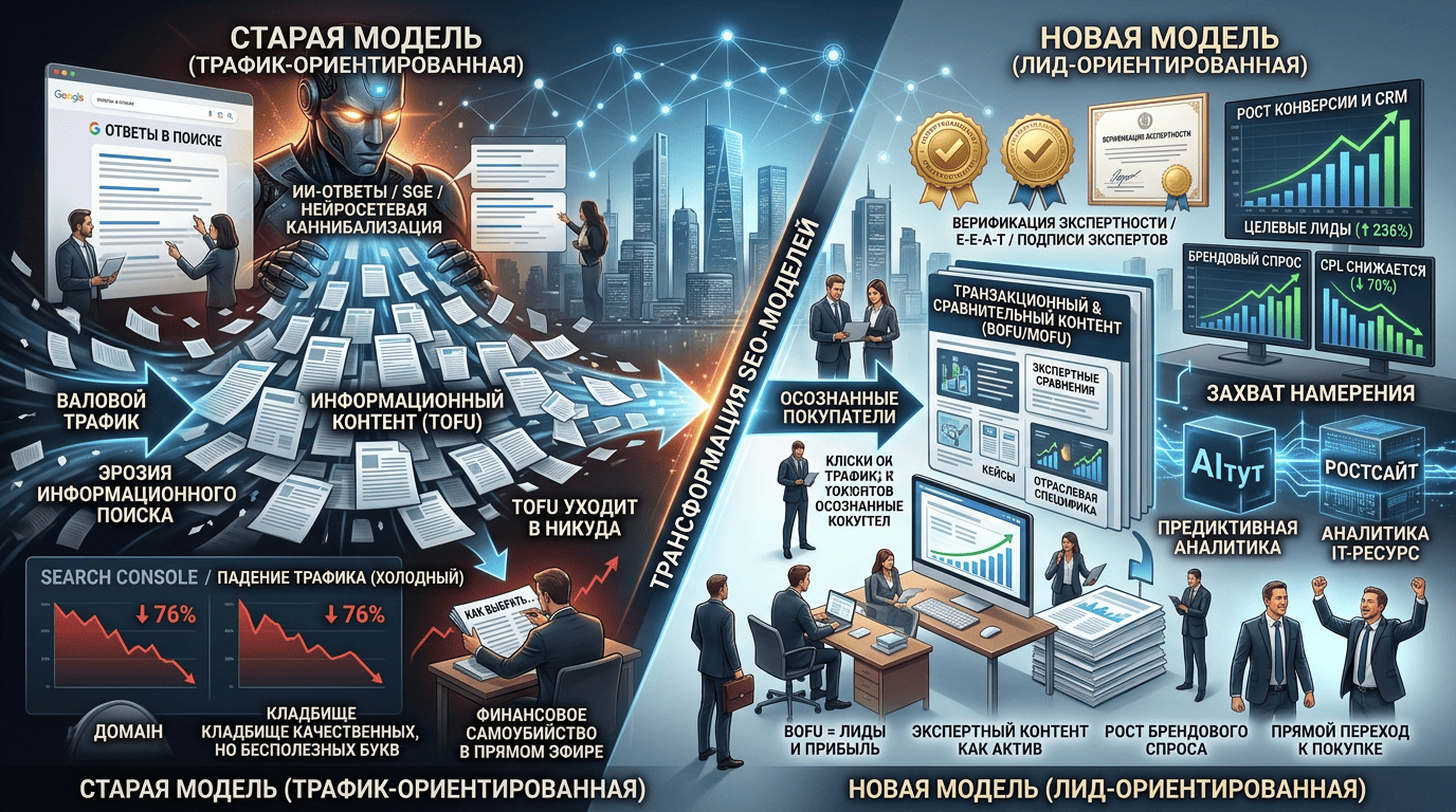 Столкнувшись с падением кликабельности (CTR) на информационных запросах, разумно пересмотреть распределение ресурсов. Практика показывает: пока статьи-словари теряют охваты, страницы, нацеленные на завершение сделки ($BOFU$), удерживают позиции и генерируют целевые лиды.